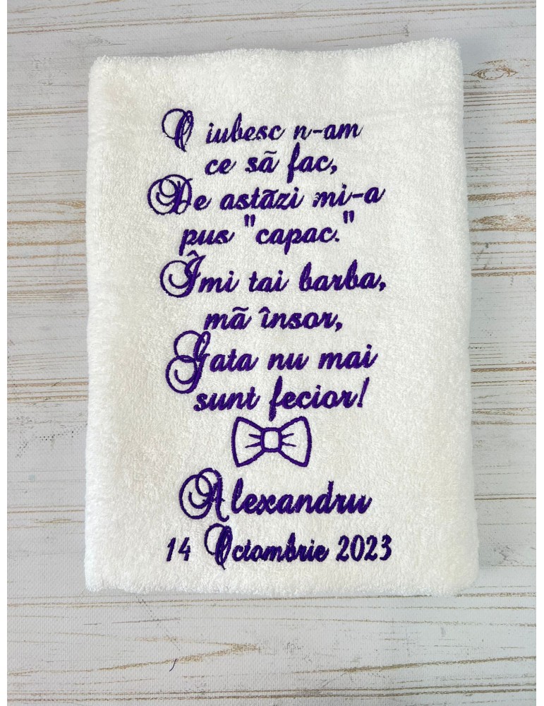 Pretul este pentru un singur prosop ginere si include personalizarea cu numele mirilor, data evenimentului si citatul preferat.