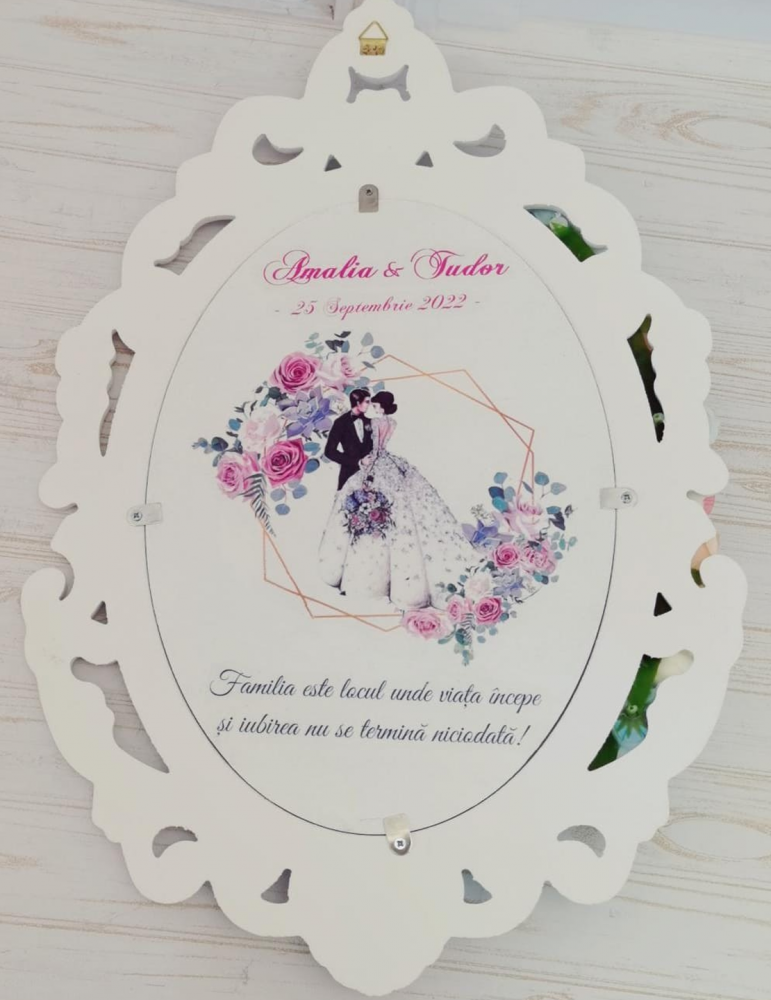 Acest produs este lucrat respectand detaliile de grafica primite de la client, pornind de la tematica nuntii, culori predominate, mesaje preferate etc.