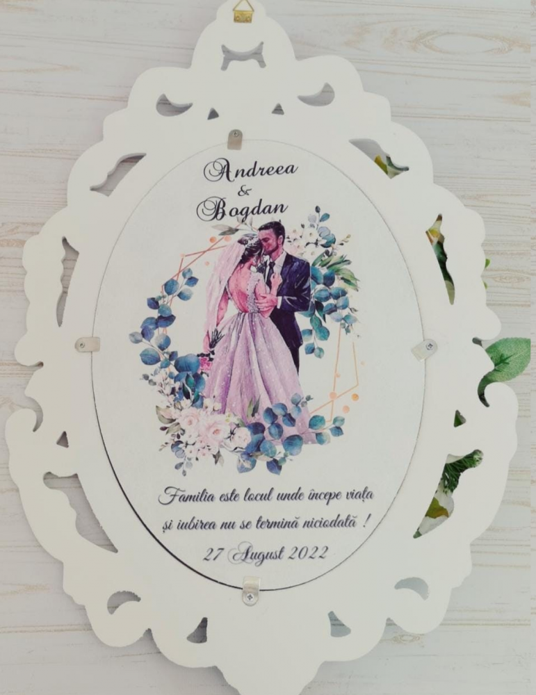 Acest produs este lucrat respectand detaliile de grafica primite de la client, pornind de la tematica nuntii, culori predominate, mesaje preferate etc.