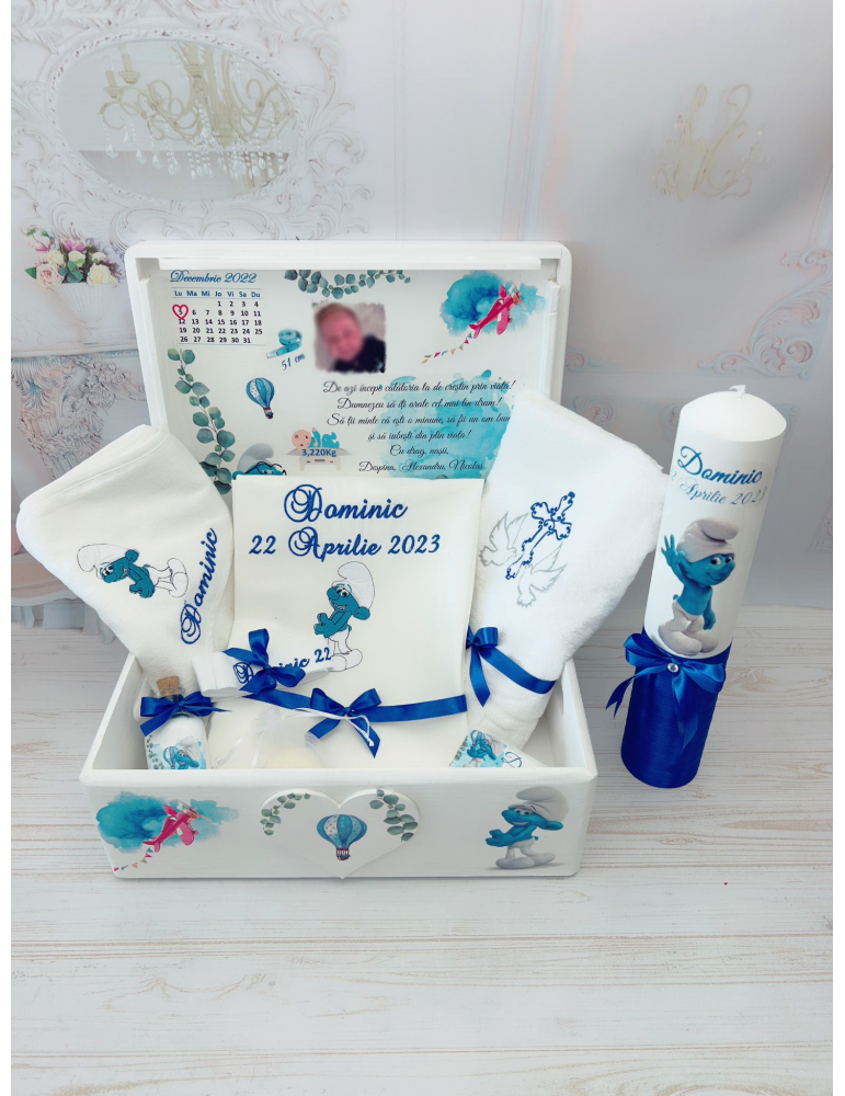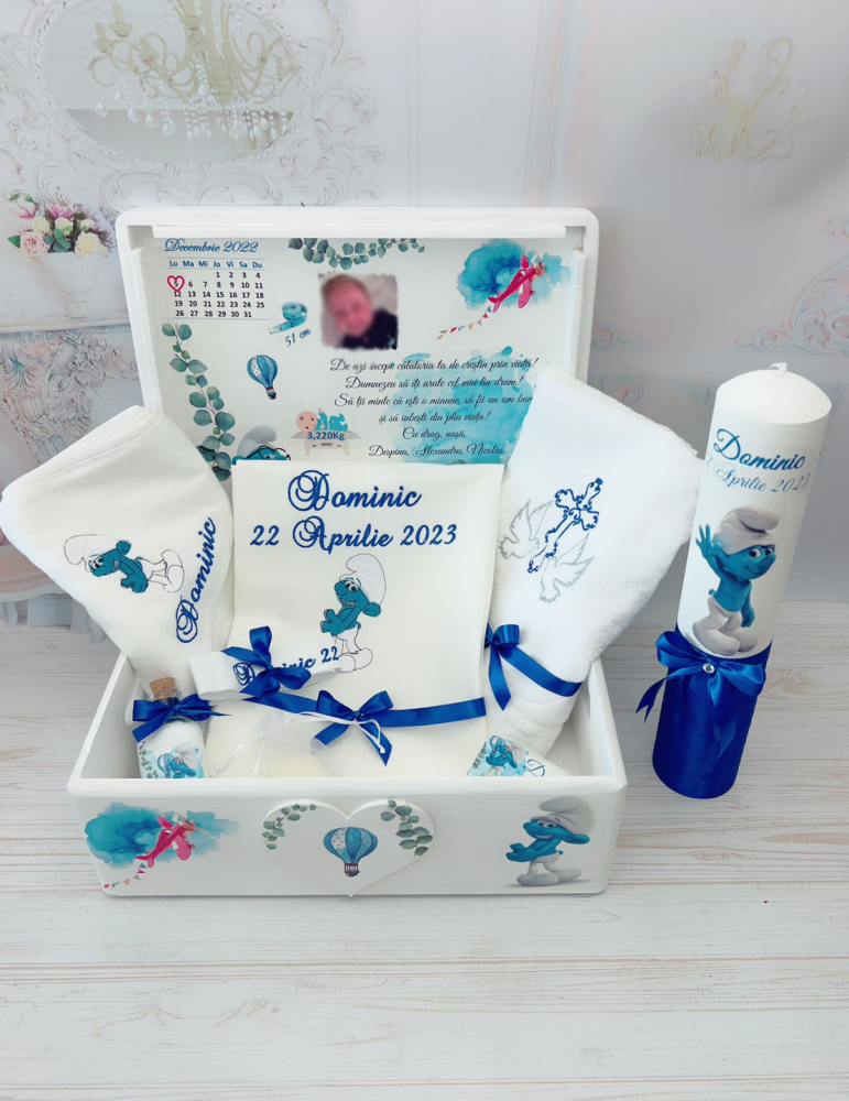 Set de botez brodat personalizat cu tematica Strumfi
