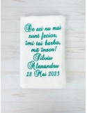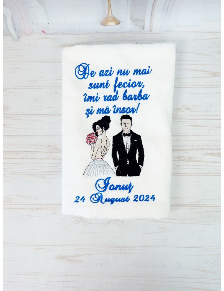 Pretul este pentru un singur prosop ginere si include personalizarea cu numele mirilor, data evenimentului si citatul preferat.