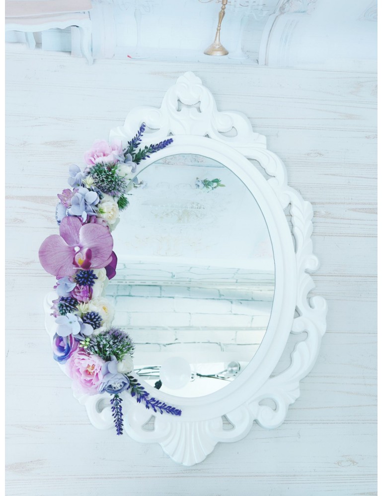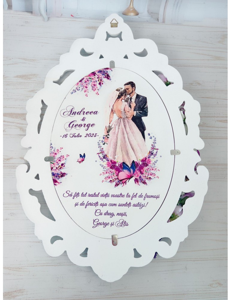 Oglinda miresei din lemn personalizata cu tematica lavanda si flori mov