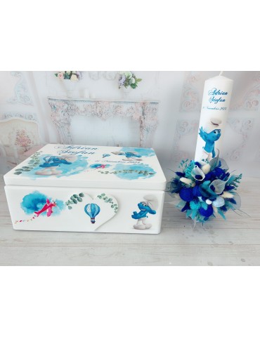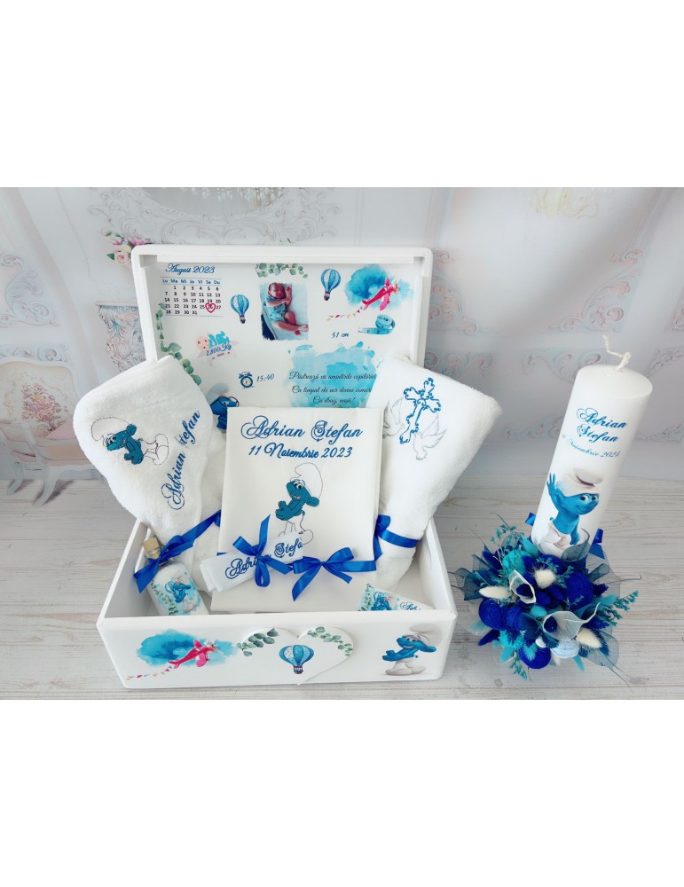 Cutie amintiri trusou brodat si lumanare cu tematica strumfi
