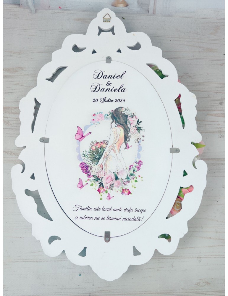 Acest produs este lucrat respectand detaliile de grafica primite de la client, pornind de la tematica nuntii, culori predominate, mesaje preferate etc.