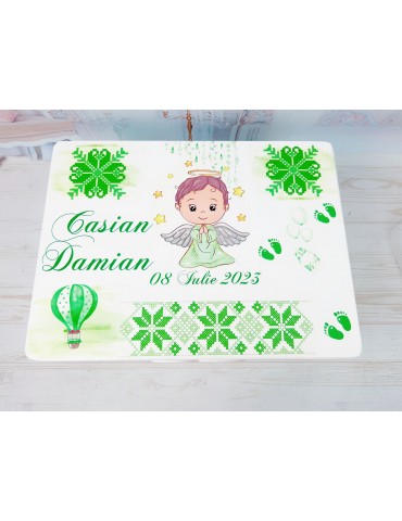 - Păturică personalizată, perfectă pentru sezonul rece, cu numele copilului și data botezului;