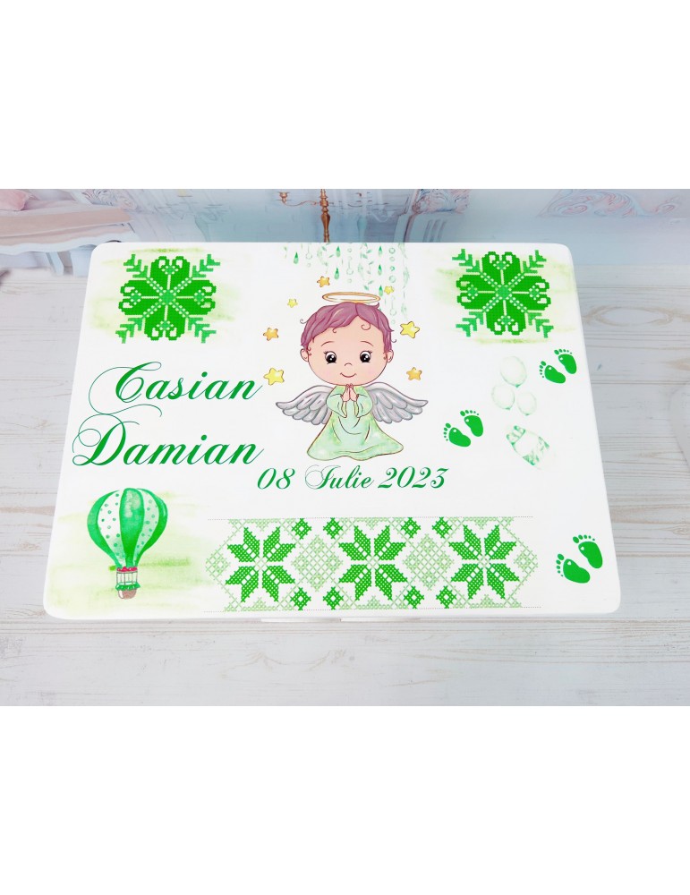 Lucrată manual din lemn, cutia este vopsită, lacuită în trei straturi pentru rezistență în timp și decorată cu grafica personalizată folosind tehnica decoupage. Personalizarea cutiei poate include: