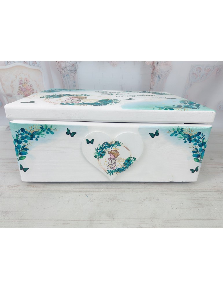 Lucrată manual din lemn, cutia este vopsită, lacuită în trei straturi pentru rezistență în timp și decorată cu grafica personalizată folosind tehnica decoupage. Personalizarea cutiei poate include: