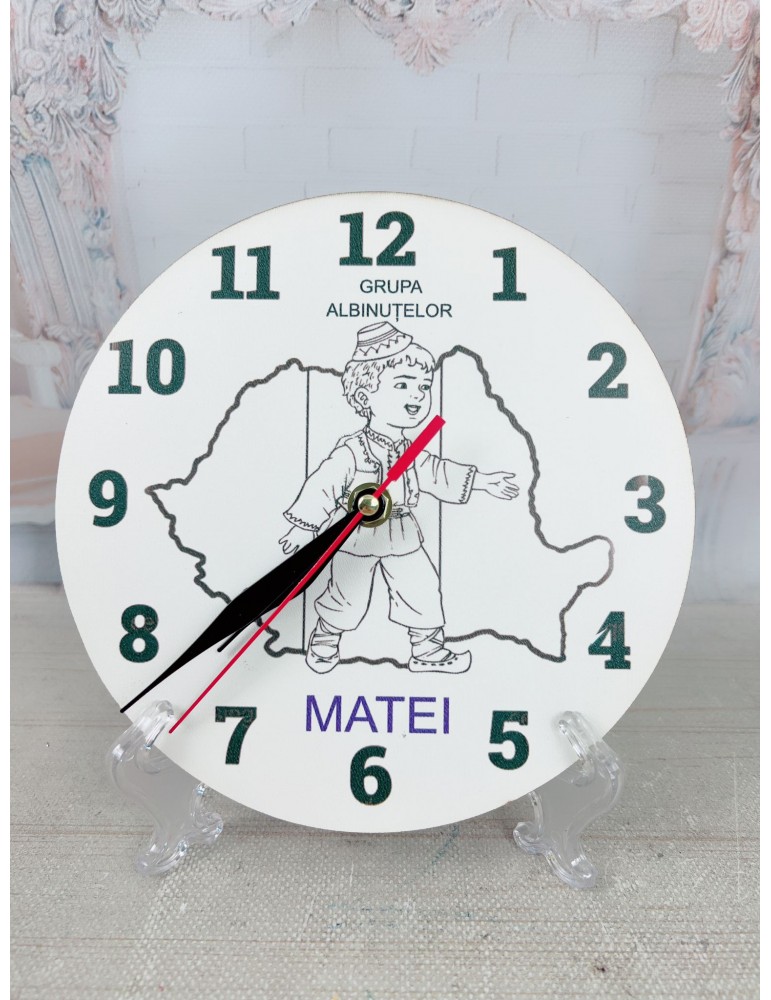 Tematica ceasului se adapteaza in functie de nevoile clasei/grupei si poate fi personalizat cu numele fiecarui copil + numele unitatii scolare.