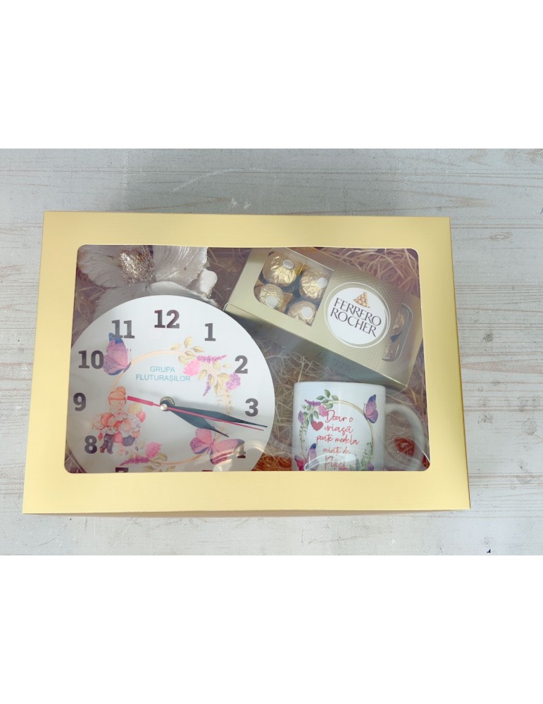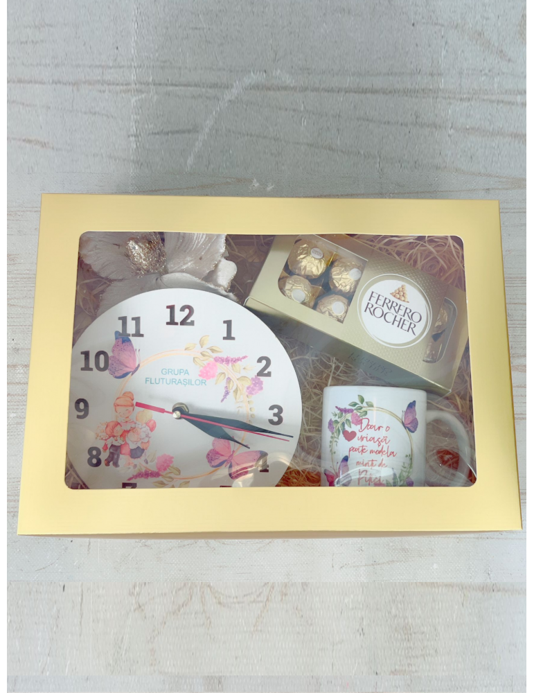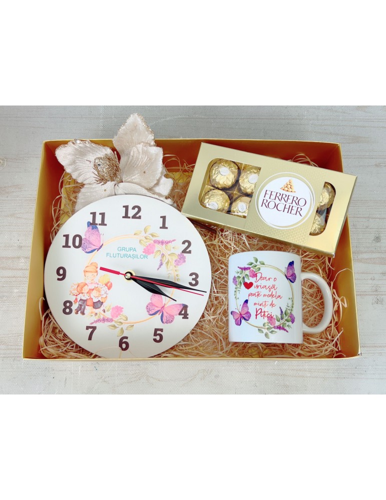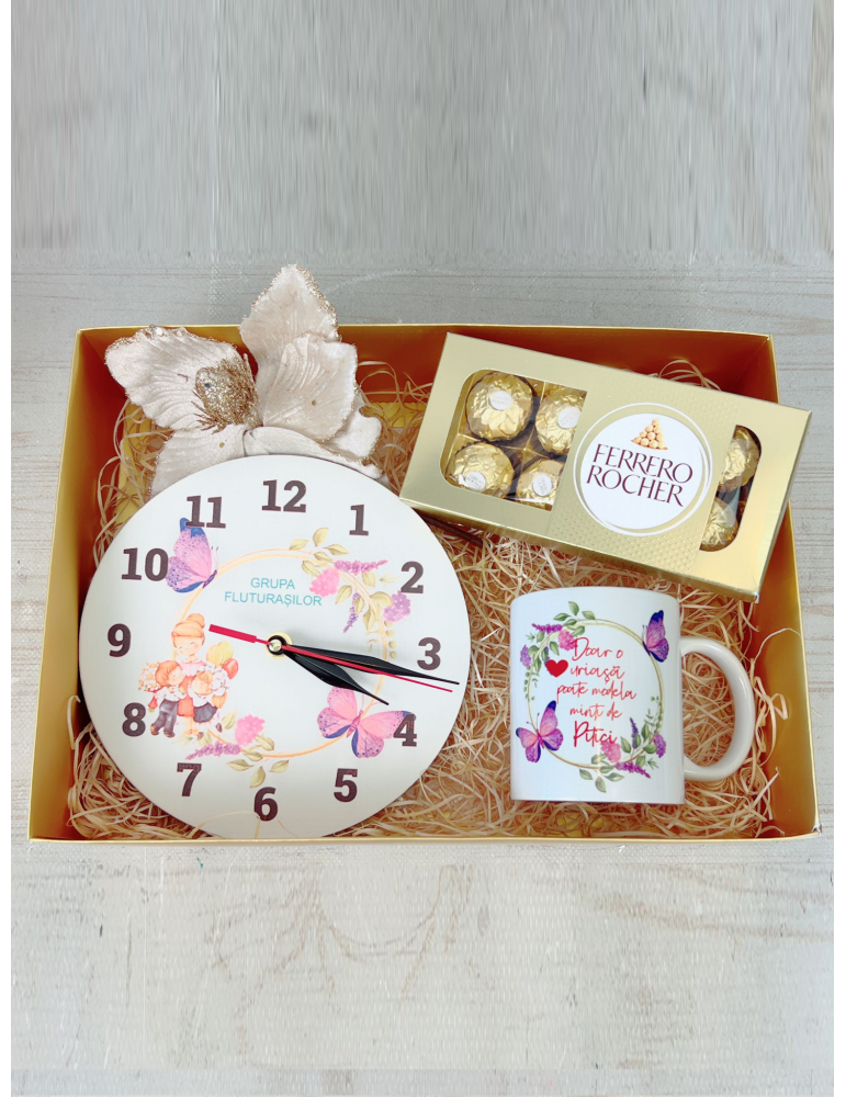 Setul cadou de Craciun pentru educatoare include un ceas personalizat cu tematica si numele grupei, o cana personalizata cu mesaj, o decoratiune de Craciun si bomboane Ferrero Rocher. Toate produsele sunt ambalate intr-o cutie cadou aurie cu funda, oferind un cadou festiv si elegant. Perfect pentru a adauga un strop de magie sarbatorilor si pentru a arata aprecierea fata de educatoare.