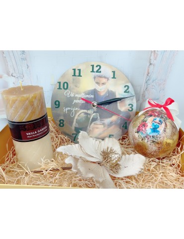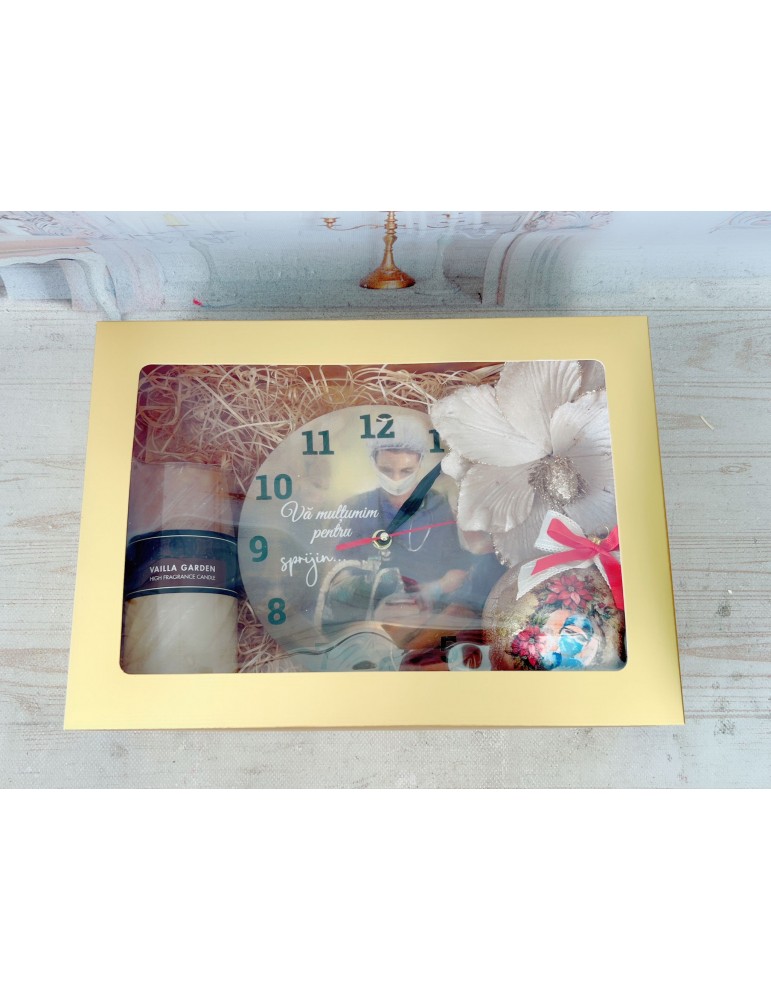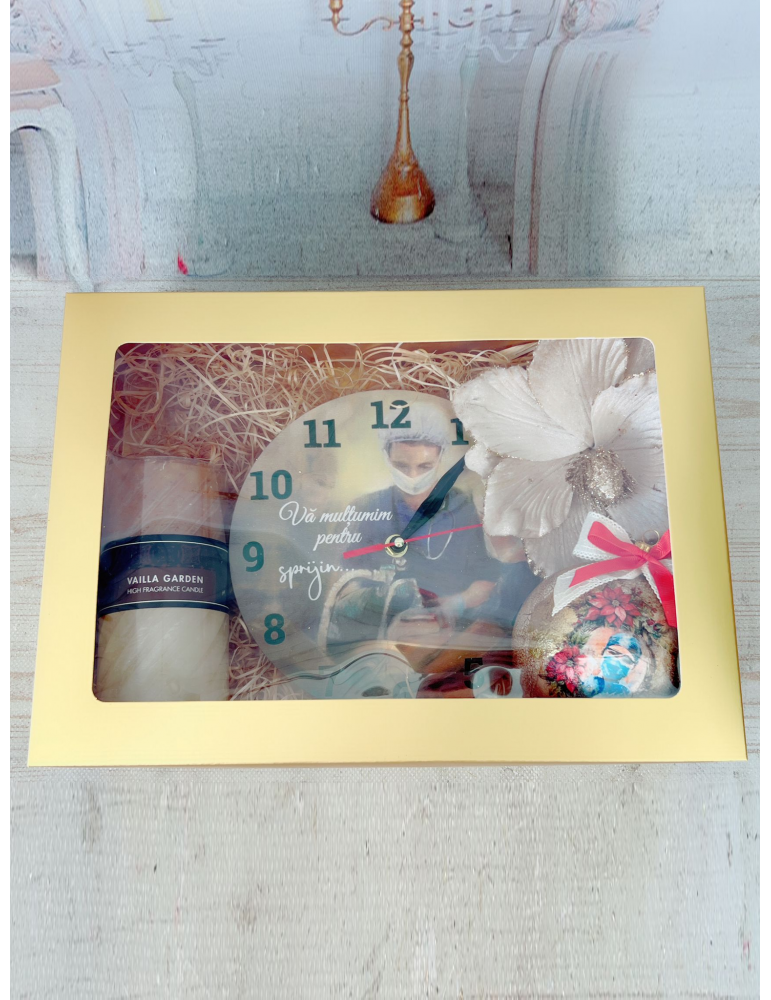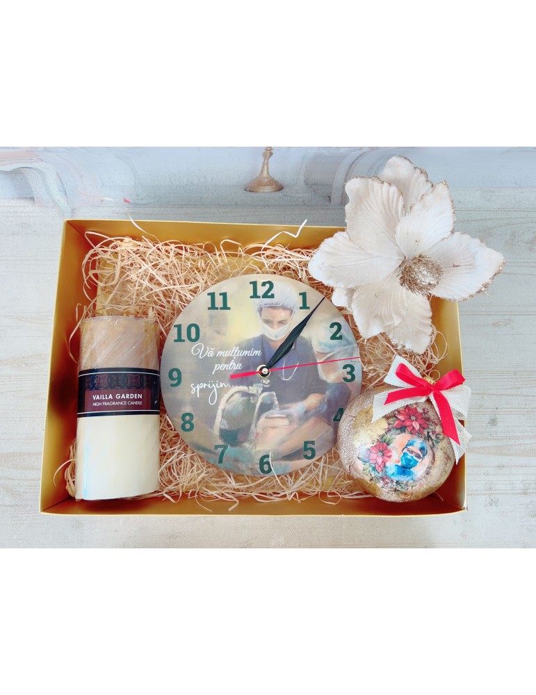 Setul cadou de Craciun pentru doctori si asistente include un ceas personalizat cu mesaj de multumire, un glob din sticla premium lucrat manual, o lumanare parfumata si o decoratiune de Craciun. Toate produsele sunt ambalate elegant intr-o cutie cadou cu funda, oferind un cadou unic si rafinat, perfect pentru a arata aprecierea fata de profesionistii din domeniul sanatatii