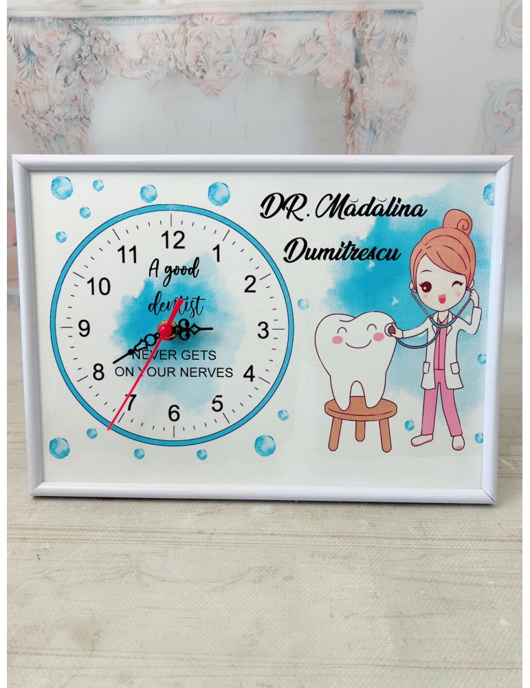 Acest tablou din lemn cu mecanism de ceas functional este o piesa unica, realizata manual, perfect pentru a adauga un plus de personalitate oricarui birou sau cabinet stomatologic. Ceasul functional este integrat in tabloul slefuit, vopsit si lacuit manual, iar imaginea unui doctor stomatolog este transferata prin tehnica decoupage, folosind hartie de matase de inalta calitate. Personalizarea se face cu numele doctorului si un mesaj ales, oferind un cadou unic si practic.