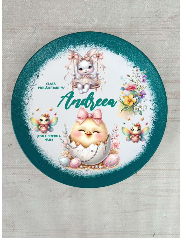 Oferă-i copilului tău o experiență creativă specială la atelierul de decoupage pe farfurie ceramică (19 cm), cu tematica Iepurașul de Paște! Într-un mediu plin de culoare și voie bună, cei mici vor decora farfurii ceramice folosind tehnici de decoupage, transformându-le în adevărate opere de artă. Fiecare copil își va personaliza farfuria cu propriul nume, creând un obiect unic, perfect pentru a fi expus cu mândrie acasă sau oferit cadou.