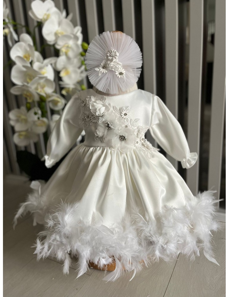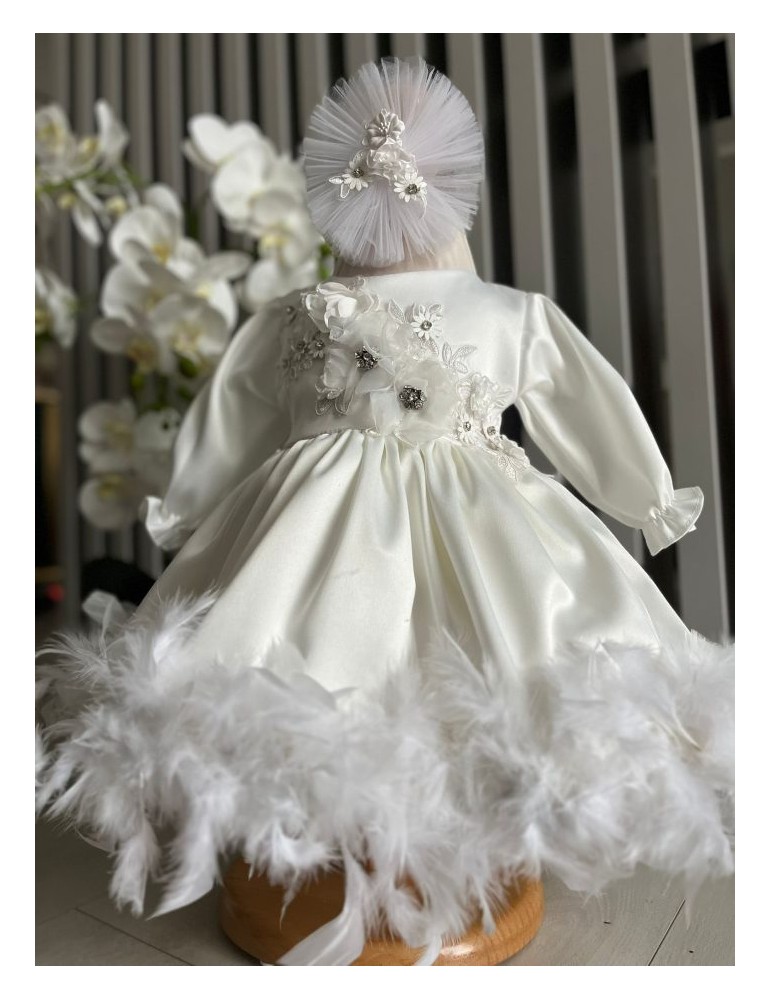 Rochiță de botez elegantă cu pene – rafinament și delicatețe pentru micile prințese