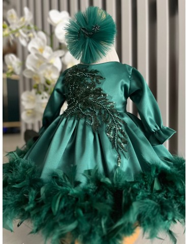 Confecționată din materiale premium, rochia impresionează prin textura fină a țesăturilor și prin croiul diafan, care conferă un aer de noblețe. Penele, atent aplicate, adaugă o notă de grație și unicitate, făcând ca fiecare mișcare a micuței să pară desprinsă dintr-un basm.
