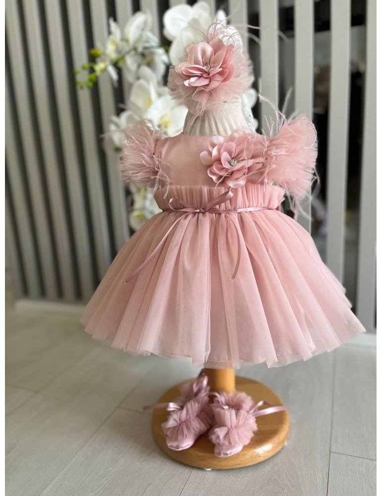 Se asortează perfect cu un trusou de botez elegant, creând un ansamblu armonios și spectaculos, potrivit pentru o zi atât de specială. Rochița este disponibilă într-o varietate de nuanțe delicate, astfel încât să se potrivească tematicii botezului și preferințelor părinților.