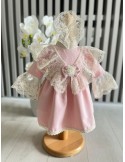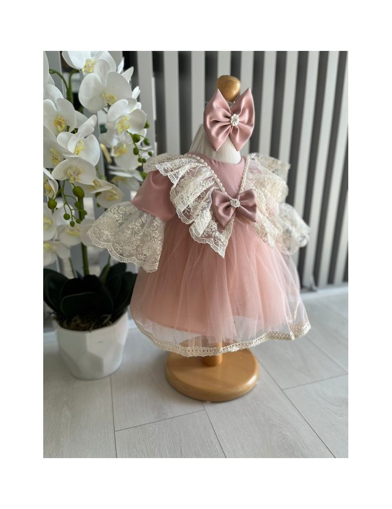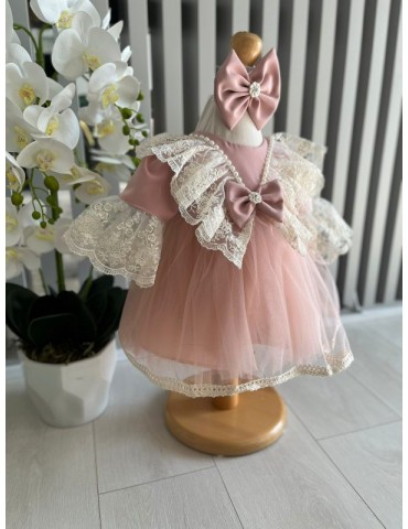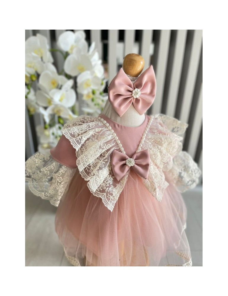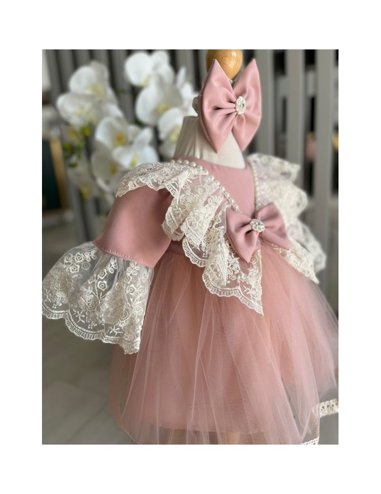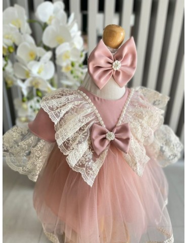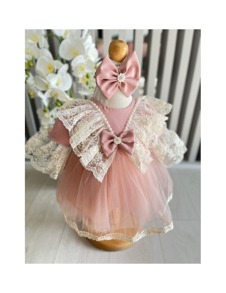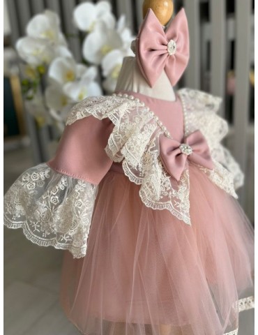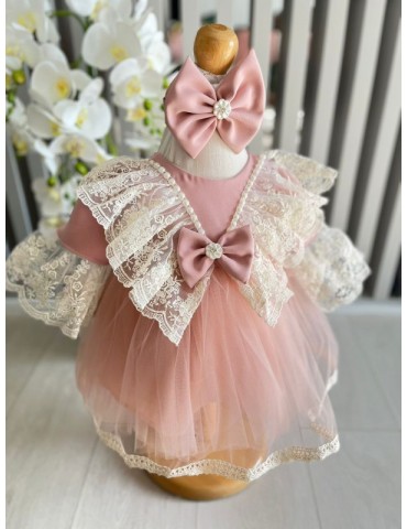 Rochie de botez pentru fetite cu tulle si dantela - roz