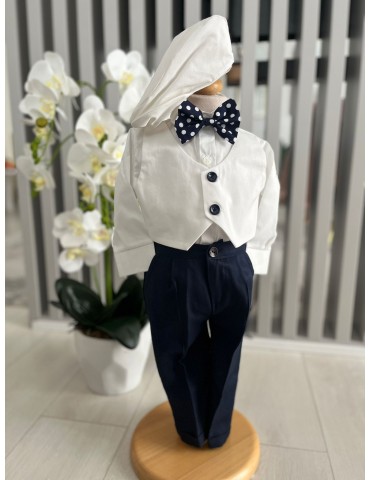 Descoperă costumul de botez pentru baieti in nuante alb si negru, un costum elegant de botez pentru băieți, perfect pentru o ceremonie de neuitat. Realizat din materiale de calitate, acest costum rafinat adaugă un plus de stil și eleganță micuțului tău în ziua specială.