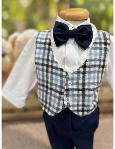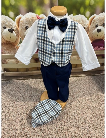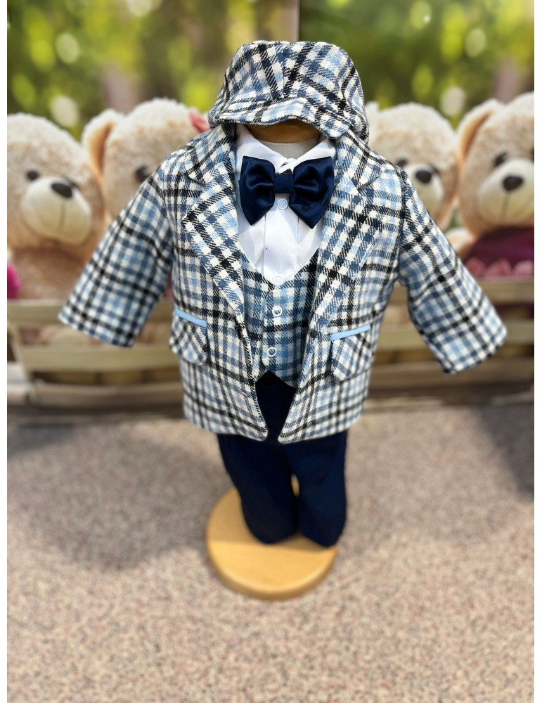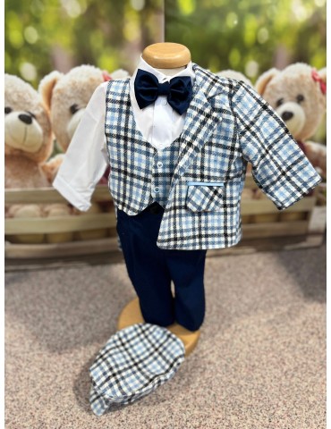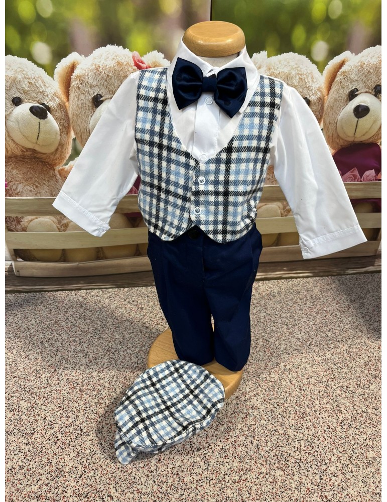 Descoperă costumul de botez pentru baieti cu carouri, un costum elegant de botez pentru băieți, perfect pentru o ceremonie de neuitat. Realizat din materiale de calitate, acest costum rafinat adaugă un plus de stil și eleganță micuțului tău în ziua specială.