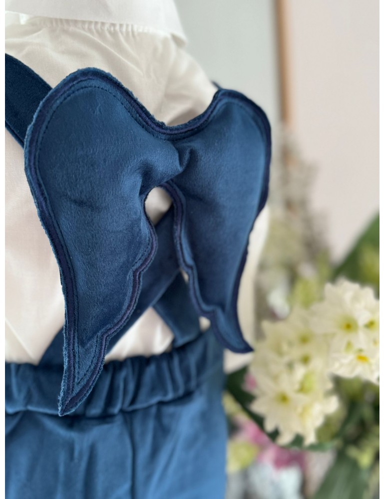 Creat cu grijă în România, costumul îmbină eleganța clasică cu un touch modern, având detalii unice precum aripi detașabile care simbolizează puritatea și inocența copilăriei. Este un set complet, atent lucrat, ce oferă confort și libertate de mișcare, astfel încât micuțul tău să se simtă lejer și special în același timp.