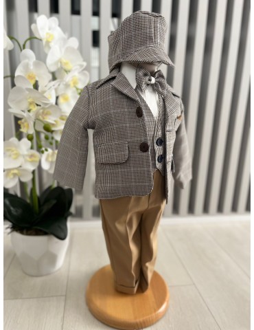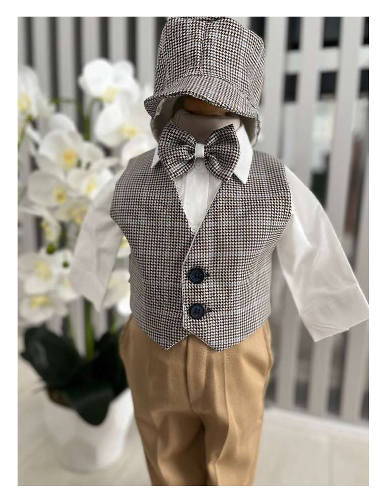Descoperă costumul de botez pentru baieti cu maro,  un costum elegant de botez pentru băieți, perfect pentru o ceremonie de neuitat. Realizat din materiale de calitate, acest costum rafinat adaugă un plus de stil și eleganță micuțului tău în ziua specială.