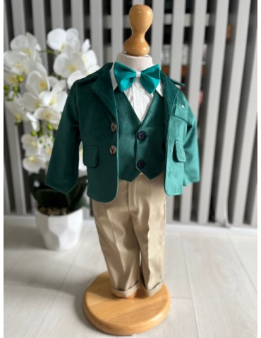 Descoperă costumul de botez pentru baieti cu verde , un costum elegant de botez pentru băieți, perfect pentru o ceremonie de neuitat. Realizat din materiale de calitate, acest costum rafinat adaugă un plus de stil și eleganță micuțului tău în ziua specială.