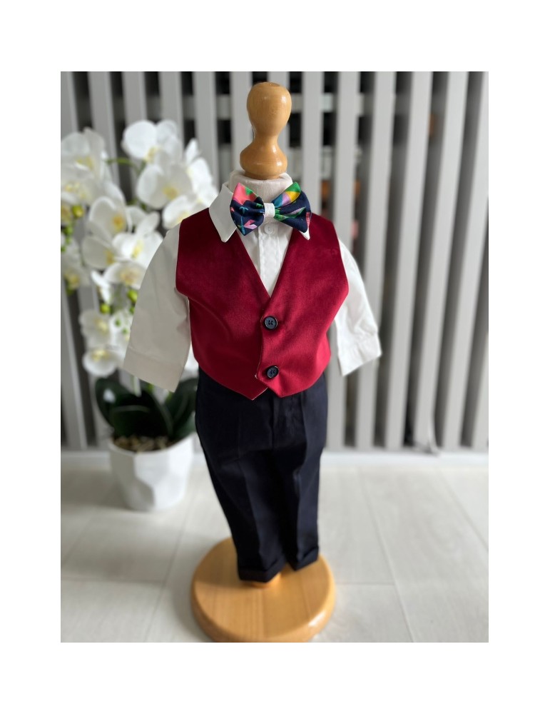 Descoperă costumul de botez pentru baieti cu rosu, un costum elegant de botez pentru băieți, perfect pentru o ceremonie de neuitat. Realizat din materiale de calitate, acest costum rafinat adaugă un plus de stil și eleganță micuțului tău în ziua specială.