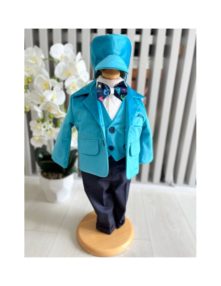 Descoperă costumul de botez pentru baieti cu turcoaz, un costum elegant de botez pentru băieți, perfect pentru o ceremonie de neuitat. Realizat din materiale de calitate, acest costum rafinat adaugă un plus de stil și eleganță micuțului tău în ziua specială.