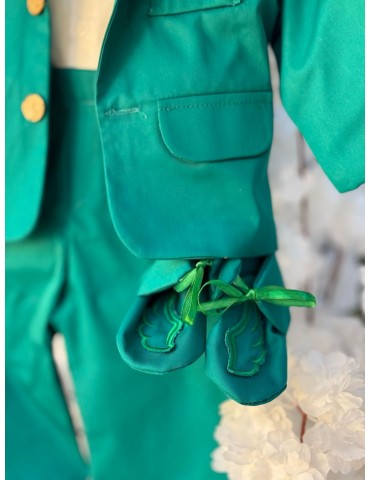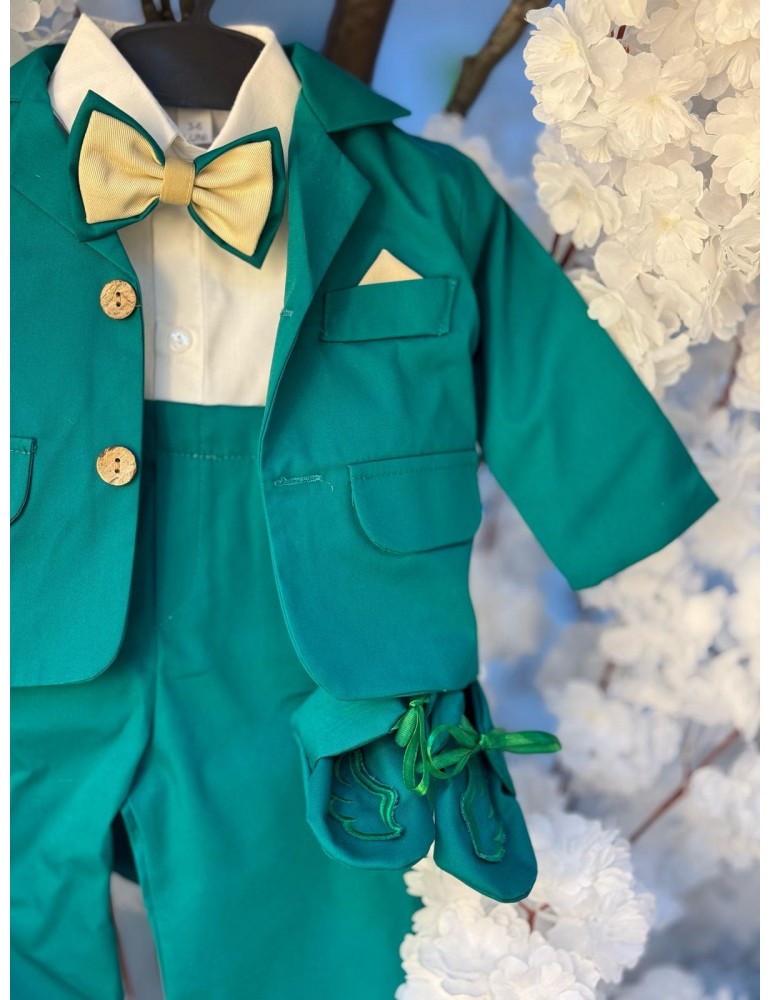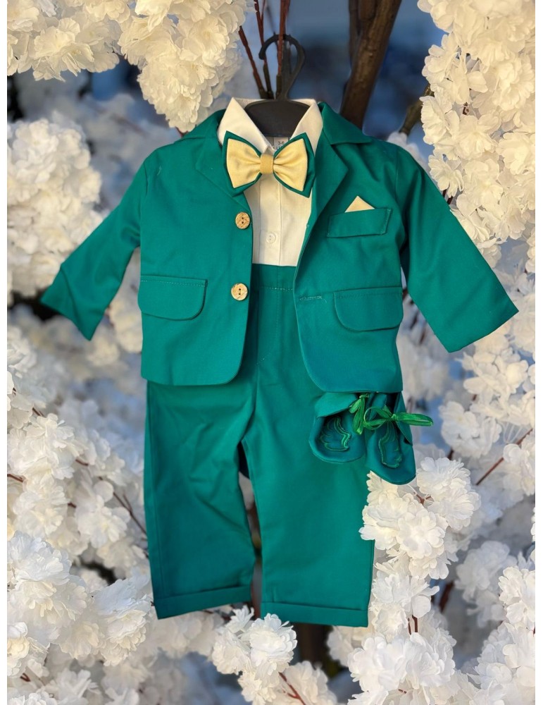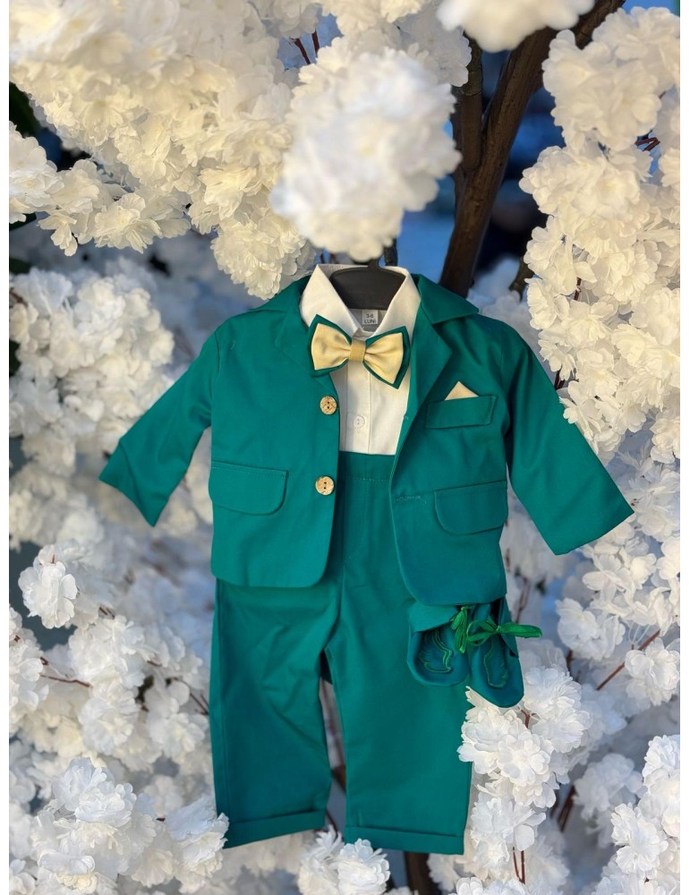 Descoperă costumul de botez pentru baieti model cu aripi, un costum elegant de botez pentru băieți, perfect pentru o ceremonie de neuitat. Realizat din materiale de calitate superioară, acest costum rafinat în nuanțe de verde adaugă un plus de stil și eleganță micuțului tău în ziua specială.