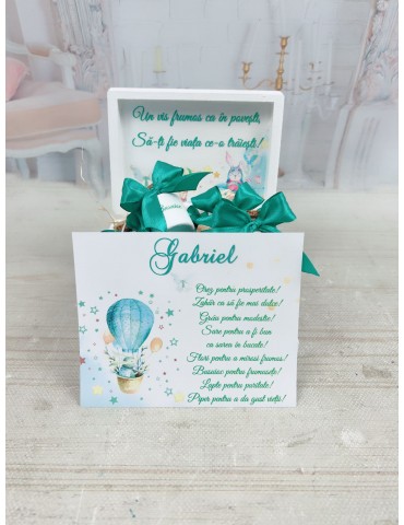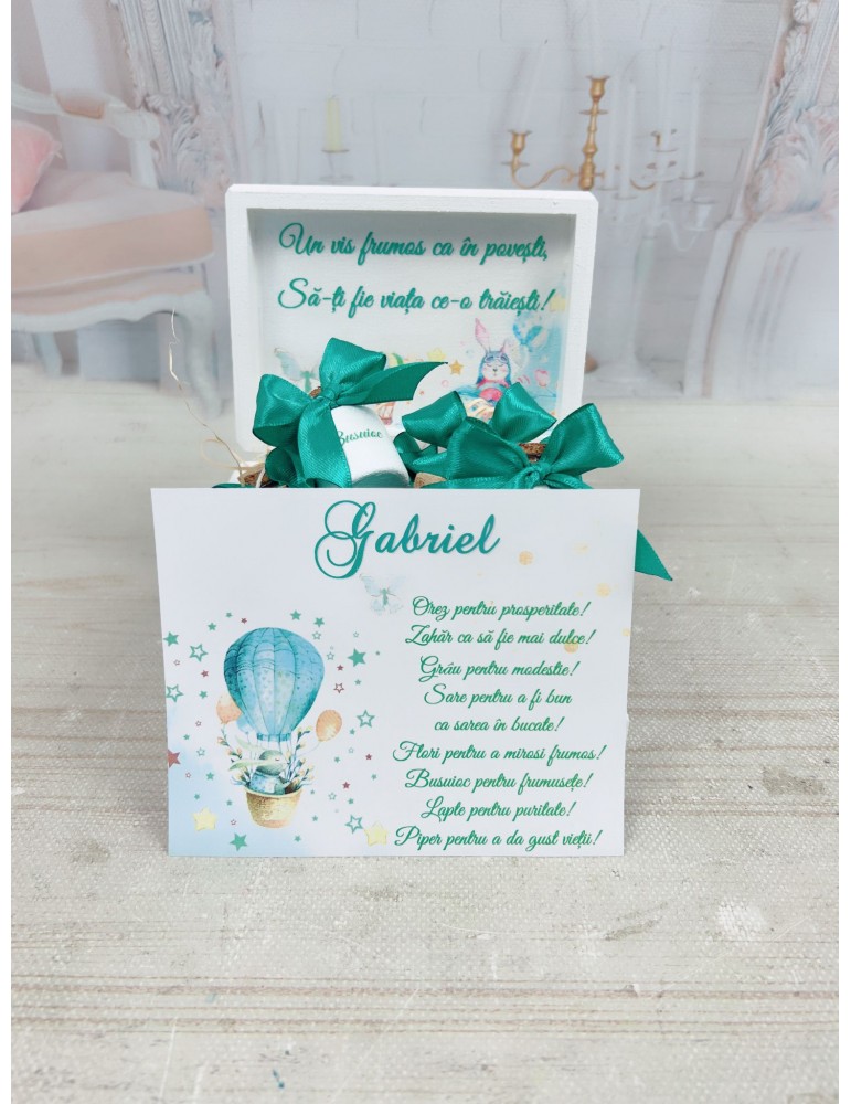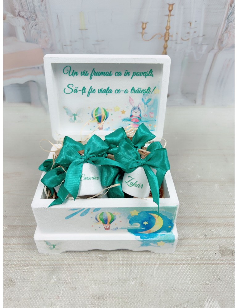 Cutiuta cu sticlute de mirodenii este un cadou simbolic pentru baia de a doua zi a bebelusului dupa botez. Mirodeniile, cu semnificatii spirituale, sunt folosite pentru purificarea si binecuvantarea micutului. Un suvenir traditional elegant, care adauga magie si spiritualitate acestei ceremonii speciale.