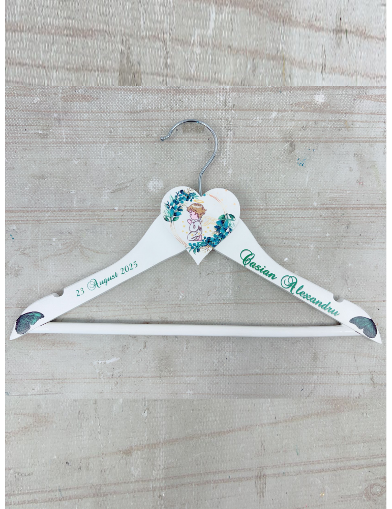 Un umeras personalizat pentru botez este un cadou delicat si memorabil, ideal pentru parintii care isi doresc sa pastreze amintirea acestui moment unic. Umerasul este confectionat din lemn de calitate, vopsit in nuante de alb, fiind personalizat cu numele copilului, data botezului si un simbol specific tematicii botezului. De asemenea, poate include o panglica de satin delicata sau alte accente elegante, care sa aduca un plus de rafinament.