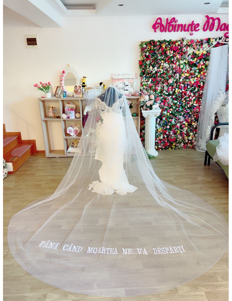 Acest model tip cathedral, cu dimensiune generoasă de 3m x 3m, este realizat pentru miresele care își doresc un efect vizual amplu, elegant și spectaculos.