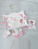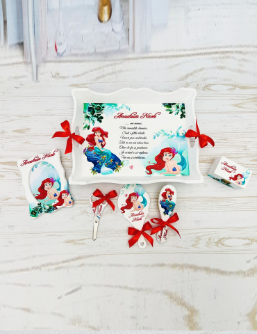 - 6 elemente: tavita, perie, oglinda, rama foto, cutiuta suvite, forfecuta