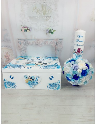 Pretul afisat se refera la setul de botez ce include: cutie amintiri, trusou brodat, lumanare de botez - personalizarea este inclusa in pret - Diametru lumanare botez