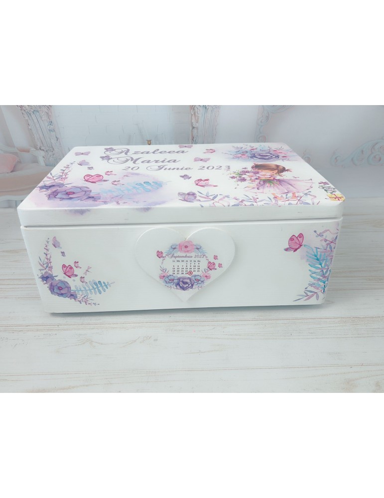 Lucrată manual din lemn, cutia este vopsită, lacuită în trei straturi pentru rezistență în timp și decorată cu grafica personalizată folosind tehnica decoupage. Personalizarea cutiei poate include: