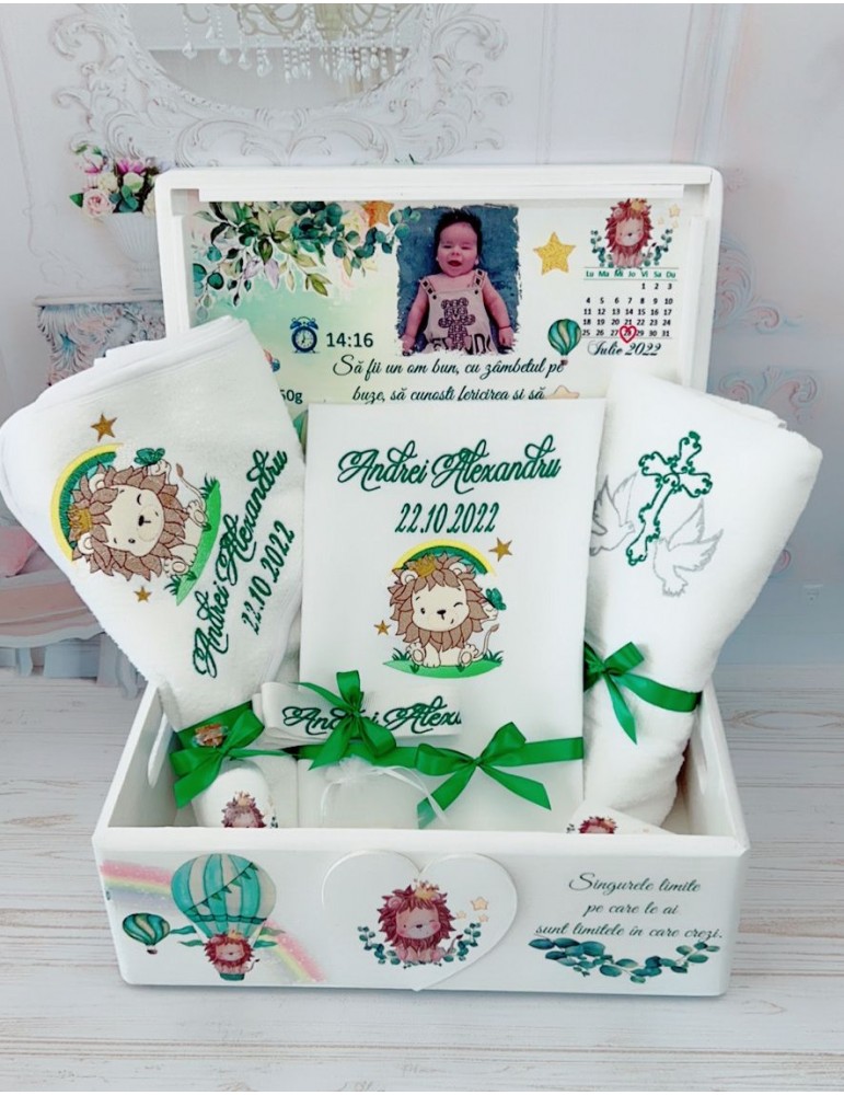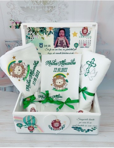 Pretul afisat se refera la setul de botez ce include: cutie amintiri, trusou brodat - personalizarea este inclusa in pret - Dimensiuni cutie de amintiri