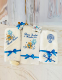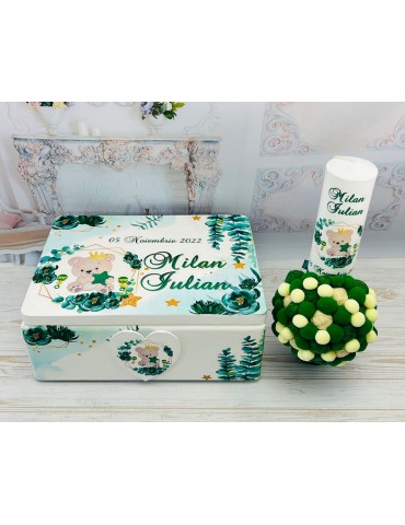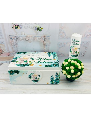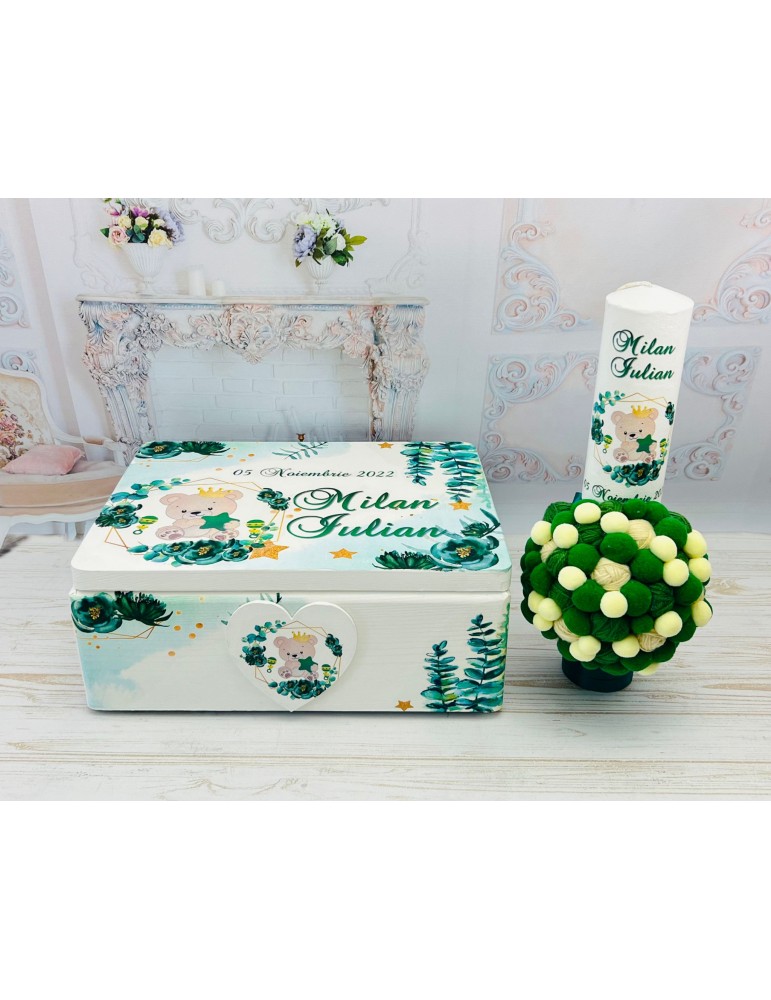 Pretul afisat se refera la setul de botez ce include: cutie amintiri, trusou brodat, lumanare de botez - personalizarea este inclusa in pret - Diametru lumanare botez