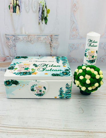 Descoperă seturile de botez personalizate pentru baieti, create pentru a transforma ceremonia de botez într-un moment cu adevărat special. Fiecare element al setului este realizat cu atenție la detalii și personalizat pentru a reflecta tematica dorită, oferindu-ți posibilitatea să păstrezi amintiri prețioase pentru o viață întreagă.