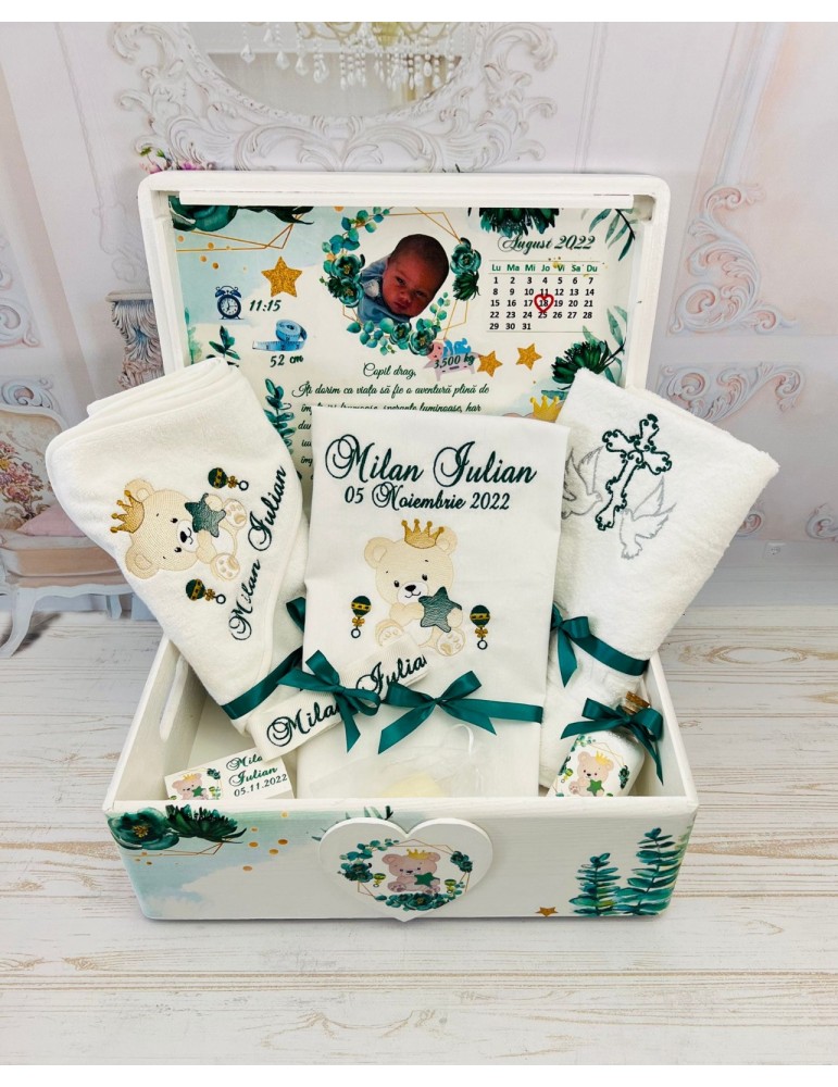 Set botez personalizat prin broderie cu ursulet nuante verde