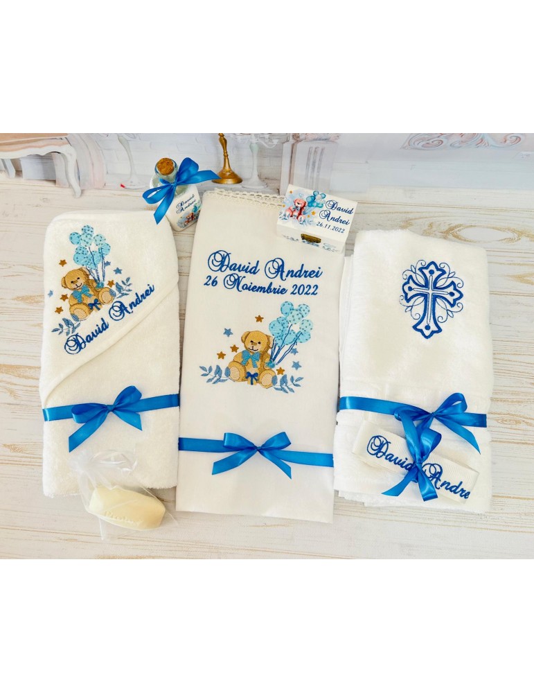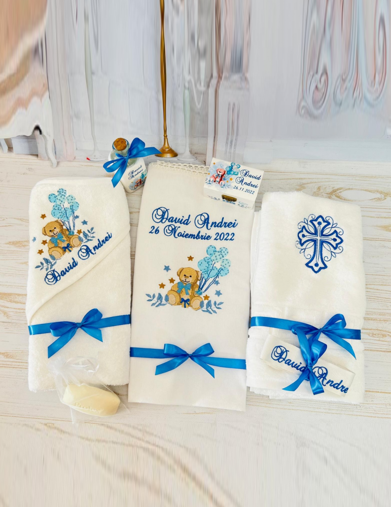 Descoperă seturile de botez personalizate pentru baieti, create pentru a transforma ceremonia de botez într-un moment cu adevărat special. Fiecare element al setului este realizat cu atenție la detalii și personalizat pentru a reflecta tematica dorită, oferindu-ți posibilitatea să păstrezi amintiri prețioase pentru o viață întreagă.