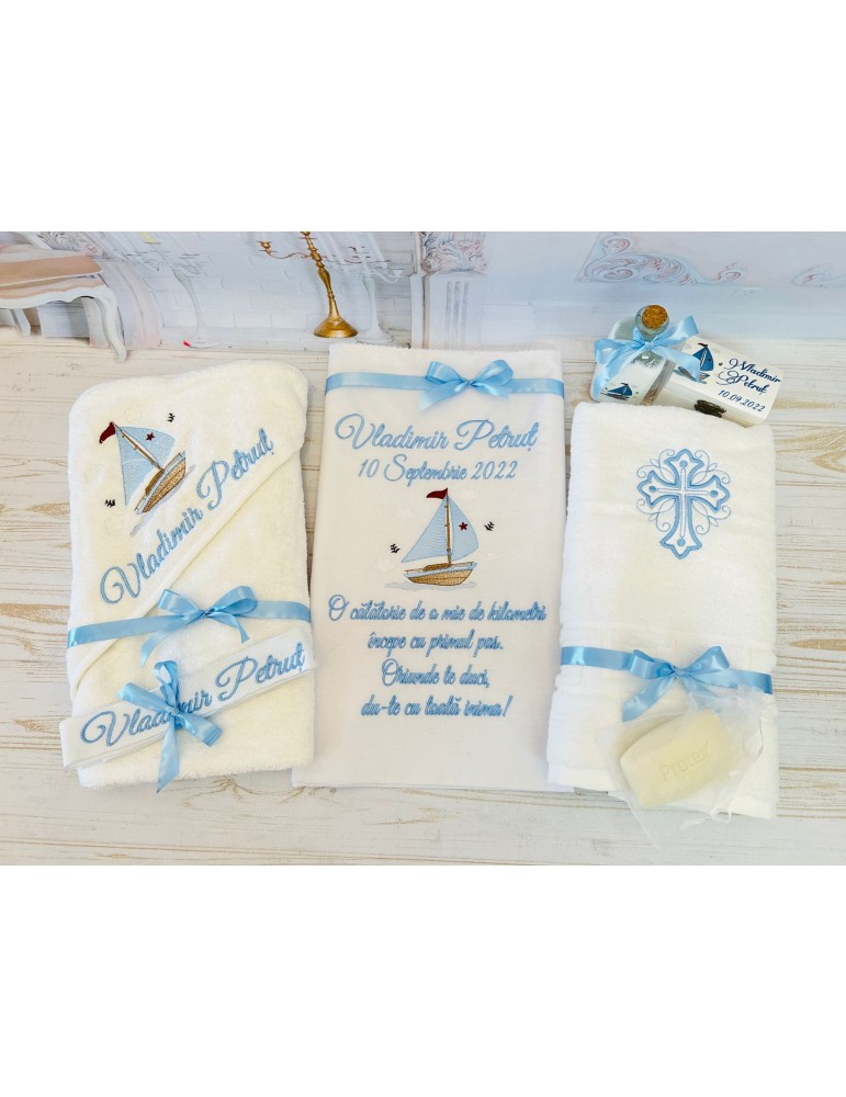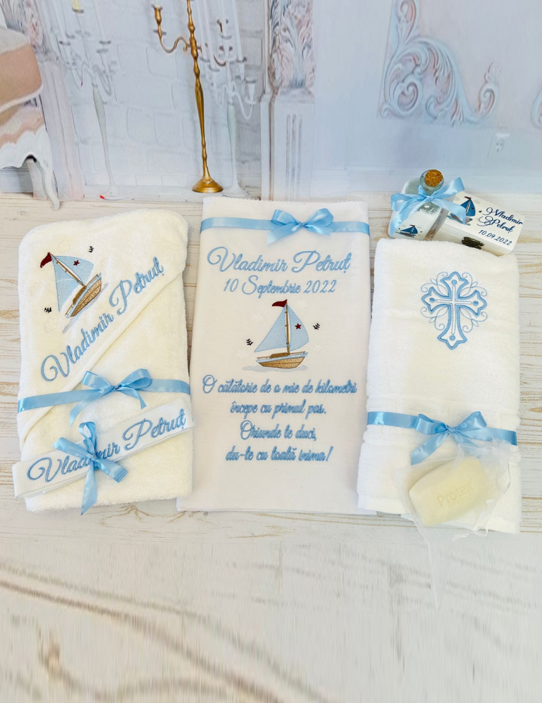 Set de botez personalizat prin broderie cu barcute