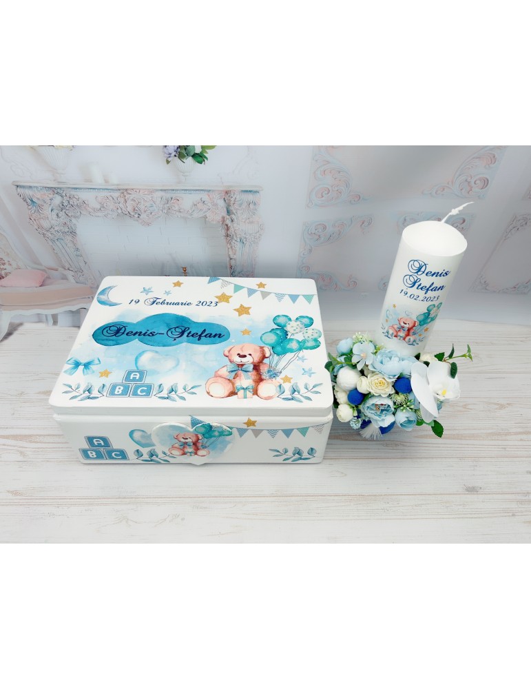 Set de botez personalizat pentru baiat cu ursulet si baloane albastre