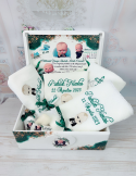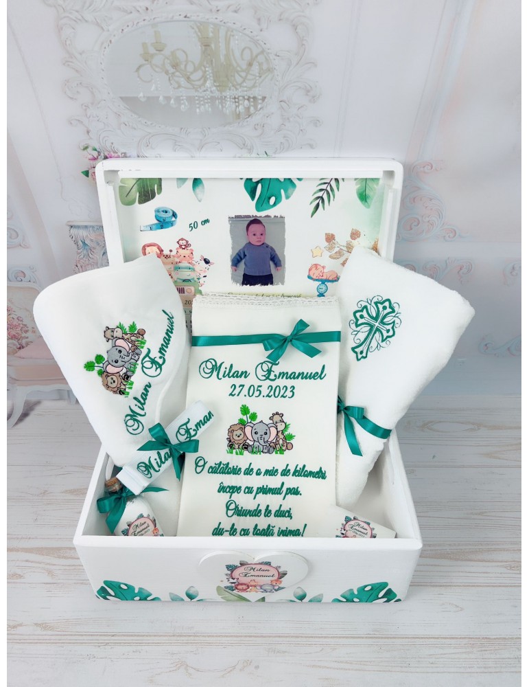 Pretul afisat se refera la setul de botez ce include: cutie amintiri, trusou brodat - personalizarea este inclusa in pret - Dimensiuni cutie de amintiri