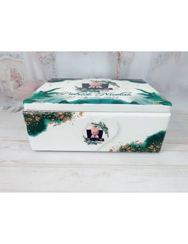 Lucrată manual din lemn, cutia este vopsită, lacuită în trei straturi pentru rezistență în timp și decorată cu grafica personalizată folosind tehnica decoupage. Personalizarea cutiei poate include: