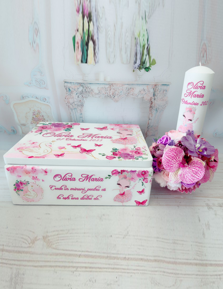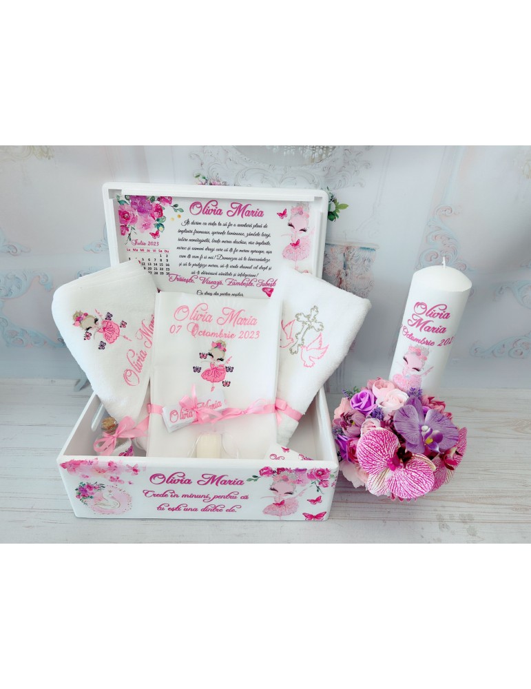 Descoperă seturile de botez personalizate pentru fetițe, create pentru a transforma ceremonia de botez într-un moment cu adevărat special. Fiecare element al setului este realizat cu atenție la detalii și personalizat pentru a reflecta tematica dorită, oferindu-ți posibilitatea să păstrezi amintiri prețioase pentru o viață întreagă.