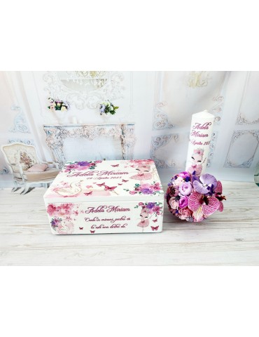 Pretul afisat se refera la setul de botez ce include: cutie amintiri, trusou brodat, lumanare de botez - personalizarea este inclusa in pret - Diametru lumanare botez