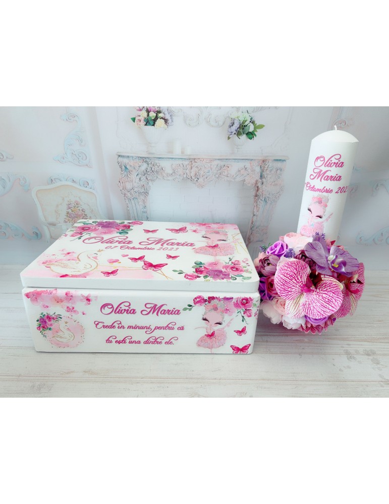 Trusou botez brodat si lumanare cu flori cu tematica balerina roz