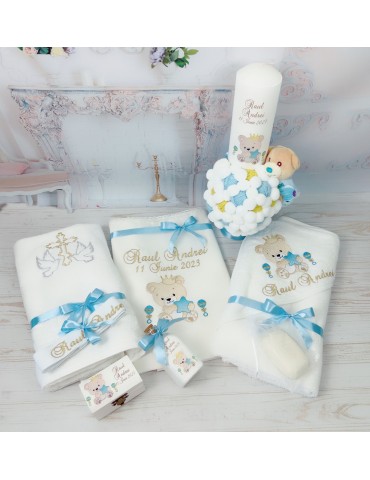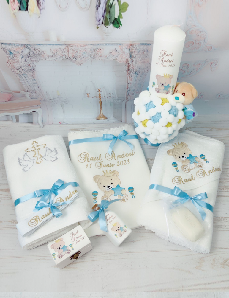 Descoperă seturile de botez personalizate pentru baieti, create pentru a transforma ceremonia de botez într-un moment cu adevărat special. Fiecare element al setului este realizat cu atenție la detalii și personalizat pentru a reflecta tematica dorită, oferindu-ți posibilitatea să păstrezi amintiri prețioase pentru o viață întreagă.