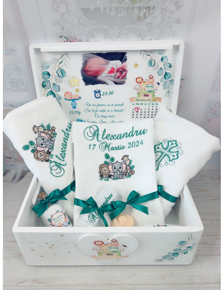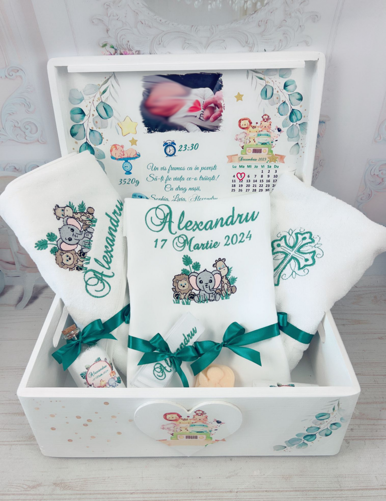 Pretul afisat se refera la setul de botez ce include: cutie amintiri, trusou brodat - personalizarea este inclusa in pret - Dimensiuni cutie de amintiri