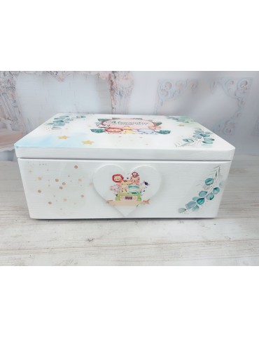 Lucrată manual din lemn, cutia este vopsită, lacuită în trei straturi pentru rezistență în timp și decorată cu grafica personalizată folosind tehnica decoupage. Personalizarea cutiei poate include: