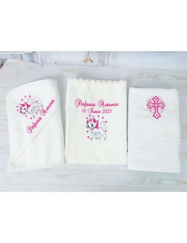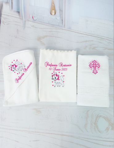 Descoperă seturile de botez personalizate pentru fetițe, create pentru a transforma ceremonia de botez într-un moment cu adevărat special. Fiecare element al setului este realizat cu atenție la detalii și personalizat pentru a reflecta tematica dorită, oferindu-ți posibilitatea să păstrezi amintiri prețioase pentru o viață întreagă.